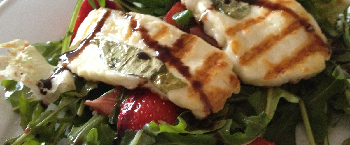 Jetzt die Minze, Basilikum, Rucola und die Salatblätter sorgfältig unter die Erdbeeren heben. Je 2 Scheiben Halloumi auf einen Teller legen und etwas Erdbeersalat auf den Käse häufen und 2 Scheiben Schinken darauf drapieren. Dekorativ mit weiteren Salatblättern garnieren, noch einige Tropfen Balsamico-Essig und Olivenöl darüber träufeln und servieren.
