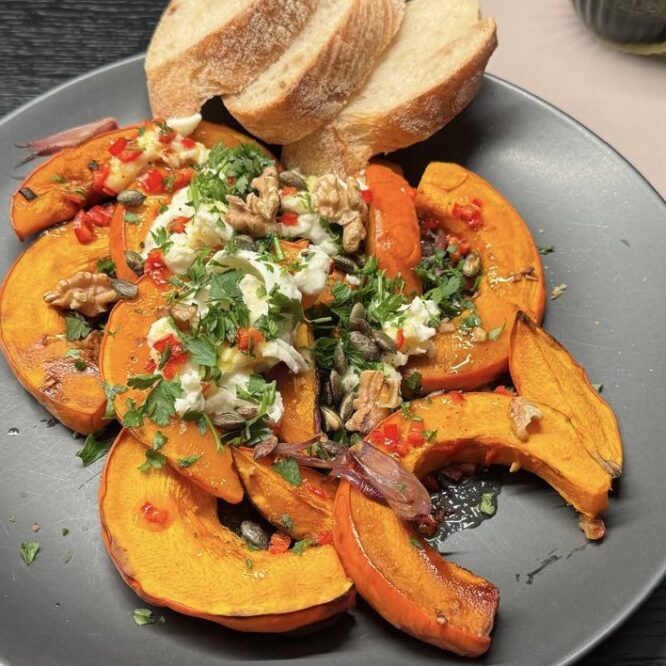 Wenn der Kürbis nach 20 Minuten fertig ist, auf Tellern anrichten und den Mozzarella darauf verteilen. Mit der Chili-Honig-Soße beträufeln und mit den Nüssen und der Petersilie bestreuen.