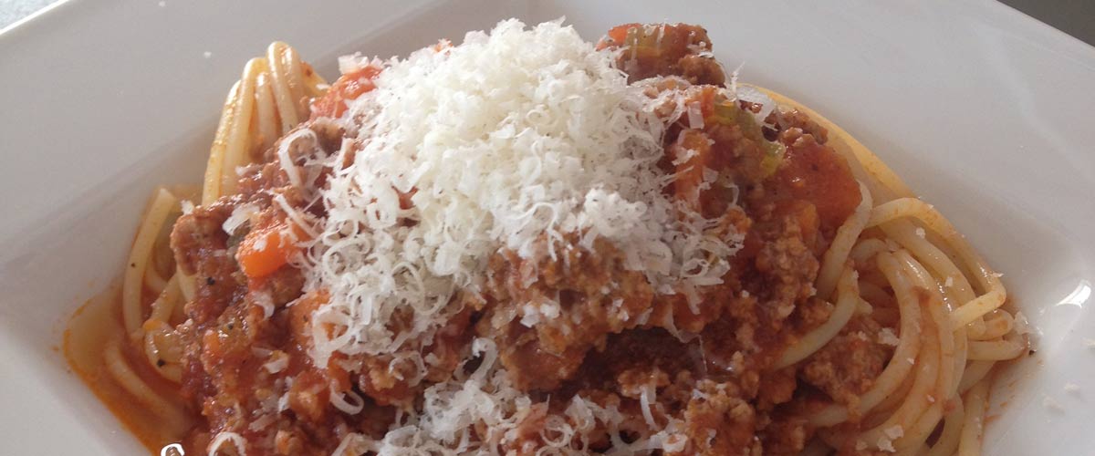 Die Spaghetti abgießen und mit der Bolognese vermischen. Auf eine Teller mit Parmesan servieren.