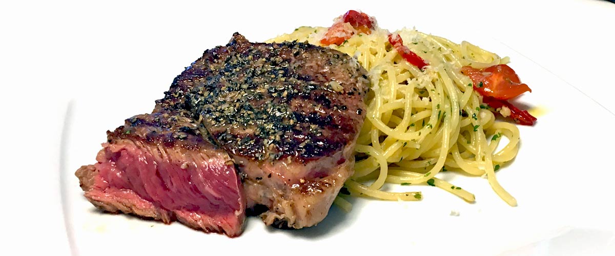 Pfanne (am besten Grillpfanne) mit Schweineschmalz oder Pflanzenöl stark erhitzen. Topf mit Wasser für Nudeln aufsetzen und den Ofen auf ca. 100°C vorheizen.