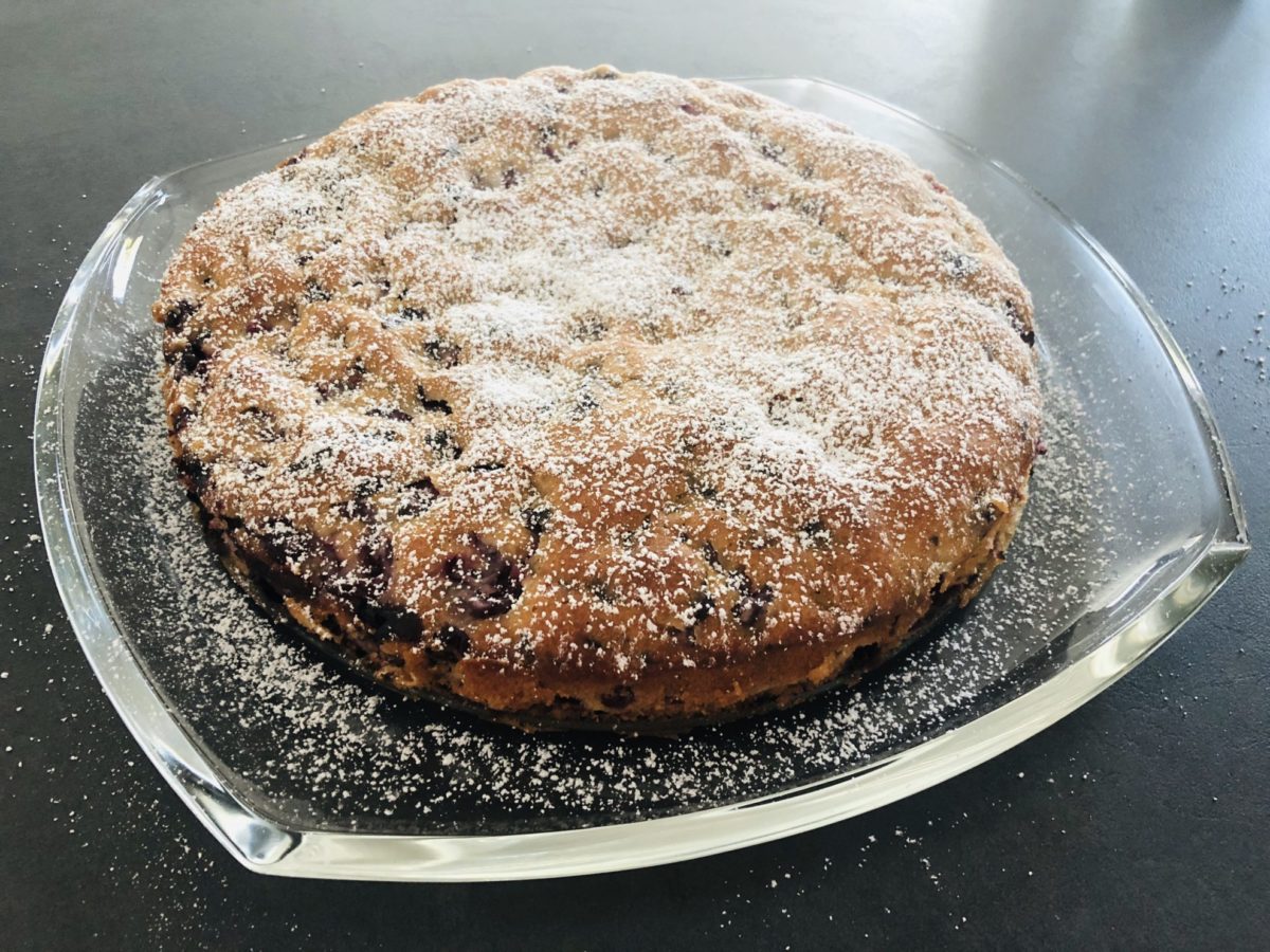 Den Kuchen auskühlen lassen, aus der Form lösen, das Backpapier abziehen, auf eine Platte legen und mit Puderzucker bestäuben.